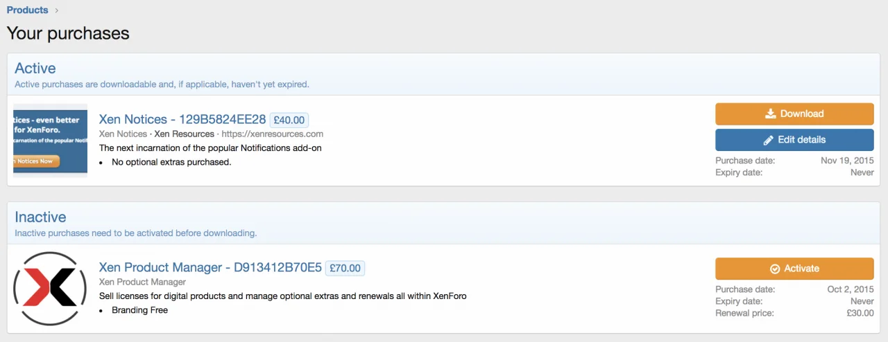 For the avoidance of doubt, purchasing a license entitles you to the use of XR Product Manager on a single XenForo installation. If you wish to install XR Product Manager on more than one installation then you must buy additional licenses.